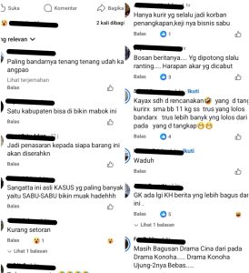 “Kasihan kayaknya jadi korban itu, kalau emang itu mereka kurir kenapa pas di Bontang enggak ditangkap, kan bisa dapat akarnya, kenapa harus diikuti aja dan di Sangatta baru ditangkap. Lagian di Sangatta juga bukan pas lagi transaksi, kenapa enggak ditangkap pas tau itu mobil membawa narkoba, kok dibuat kayak cerita drama,” tulis salah satu warga Sangatta melalui akun medsos @U*ip M*ndau dalam komentar berikutnya.